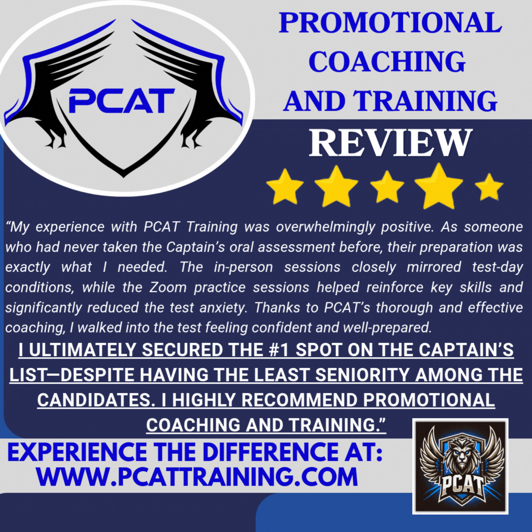 Step into the future of police promotional prep with a course led by a police Captain, with 23 years of experience and a proven track record of top scores (three promotions on three exams, all in or near the top 10 scores in the state), including a perfect score on the captain’s oral examination. In addition to all of the custom study materials you need to get promoted, you’ll also get the study techniques, test taking techniques, study/test experience and all of the notes that built that success.