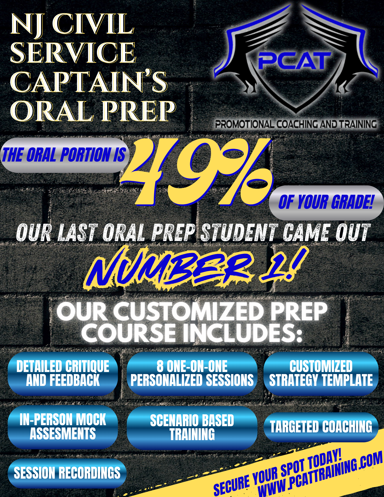 This one on one program is built specifically for candidates preparing for the New Jersey Civil Service Captain’s oral exam. It includes a minimum of eight personalized sessions designed to help you earn the best possible score — a 5 out of 5 in each category of response and tactics.